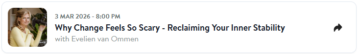 Change can feel unsettling. And the world around us is changing. Profoundly. That can stir fear. Uncertainty. Instability. What happens on a global scale often echoes into your personal life. Even when you sense that change is aligned or necessary, your body may tense. Doubt creeps in. Fear of the unknown takes over. In this live session, we explore why change activates such a deep survival response and how to shift from fear back into inner stability. You’ll begin to recognize that fear of change is not weakness, but conditioning. And conditioning can be gently rewired. Through grounded insight and an experiential meditation, we release fear around transitions and reconnect with a deeper sense of safety within yourself. You don’t need to control the future. You can learn to move with it. You are warmly welcome to join live.